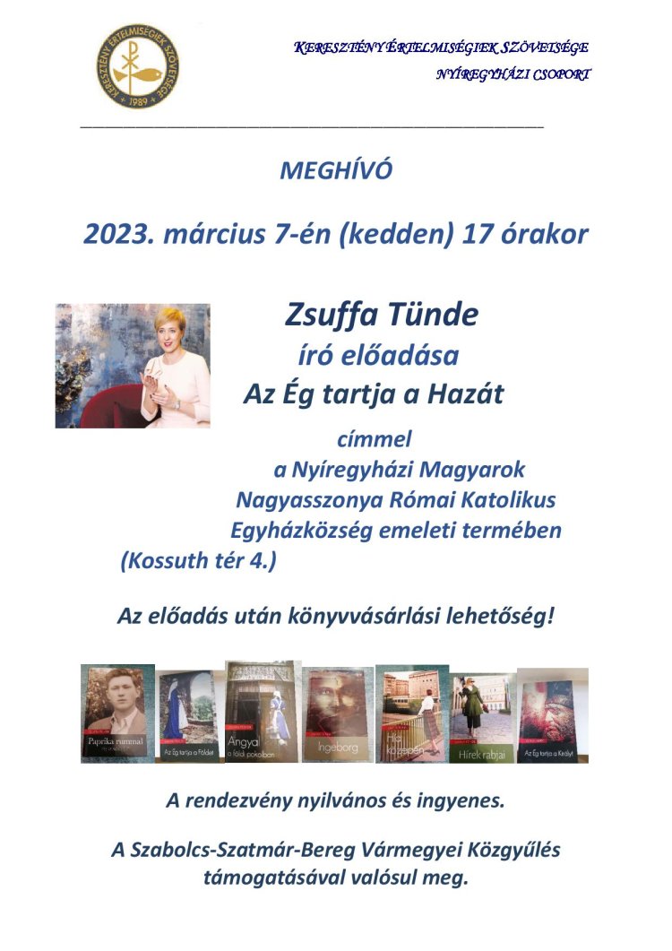 Zsuffa Tünde író, Az Ég tartja a Földet című, nagy sikerű Szent Erzsébet-regény szerzője 2023. március 7-én 17 órakor előadást tart a Magyarok Nagyasszonya Római Katolikus Egyházközség emeleti termében (Kossuth tér 4.) Az Ég tartja a Hazát címmel a Keresztény Értelmiségiek Szövetsége Nyíregyházi Csoportja szervezésében.