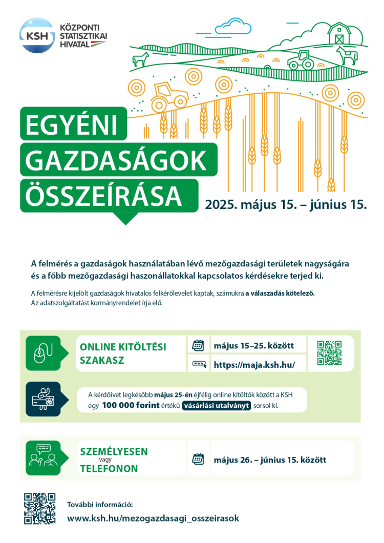 Az aktuális felvétel részleteiről és a gazdaságszerkezeti összeírás előzetes adatairól a www.ksh.hu/mezogazdasagi_osszeirasok oldal nyújt további tájékoztatást.