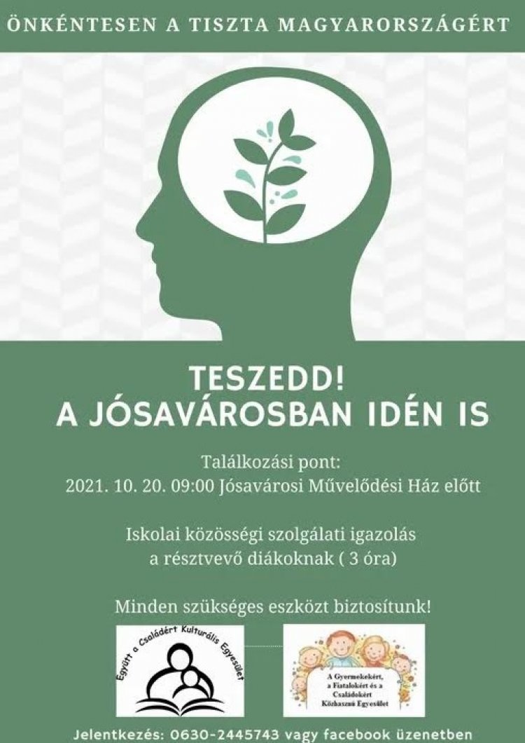 Az Innovációs és Technológiai Minisztérium (ITM) idén is megszervezi a „TeSzedd! Önkéntesen a tiszta Magyarországért” akciót, ami hazánk legnagyobb önkéntes hulladékszedési akciója. Az Együtt a Családért Kulturális Egyesület számára nem volt kérdés, hogy a jól sikerült 2019-es év után az idei évben is vállalja a jósavárosi csatlakozási pont koordinátori szerepét.