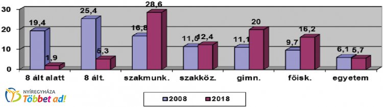 1. sz. ábra: Időskorú háztartásfők legmagasabb iskolai végzettség szerinti megoszlása, 2008, 2018