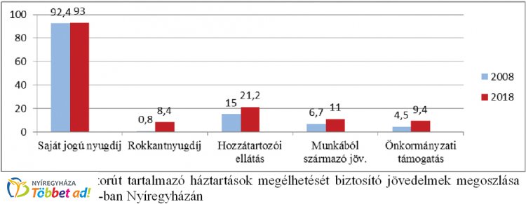 2. sz. ábra: Időskorút tartalmazó háztartások megélhetését biztosító jövedelmek megoszlása 2008-ban és 2018-ban Nyíregyházán