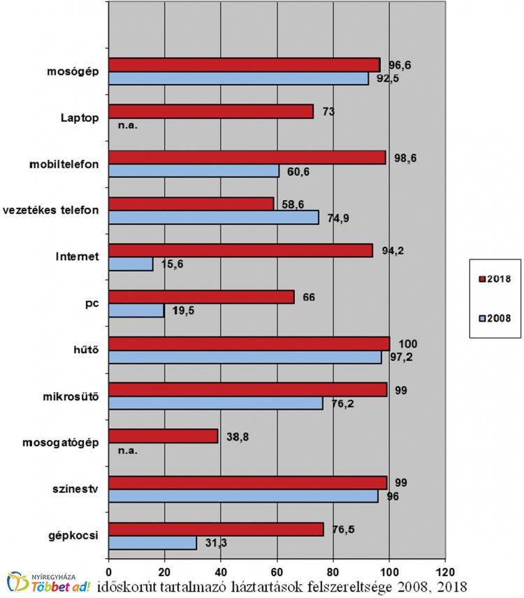 A háztartások felszereltsége lényeges változáson ment át egy évtized alatt. A mosógép, mobiltelefon, mikrohullámú sütő, hűtőszekrény ma már szinte minden háztartásban megtalálható. 2008-ban az időskorúak 15,6%-a nyilatkozta azt, hogy van internet-hozzáférése lakásában, ez 2018-ra 94,2%-ra nőtt, melyből 37,6% szélessávú internetet használ, mindezek ellenére a közszolgáltatásokról jellemzően még nem a neten keresztül tájékozódnak az időskorúak. Tíz év alatt duplájára nőtt azok száma, akiknek a háztartásában személygépkocsi is van.