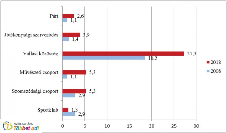 6. sz. ábra: Idősek társadalmi részvételének egyes mutatói Nyíregyházán 2008, 2018