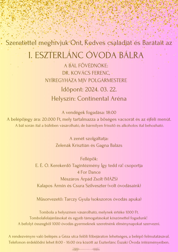 Sztárvendégekkel és az óvodához közel álló felépőkkel, és persze vacsorával várja a vendégeket az Eszterlánc óvoda. Az intézmény történetének első bálját rendezik meg.