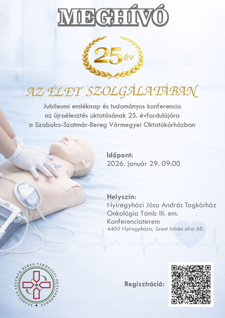 Jubileumi emléknappal és tudományos konferenciával ünnepli az újraélesztés oktatásának 25. évfordulóját a Szabolcs-Szatmár-Bereg Vármegyei Oktatókórház. Az egész napos szakmai rendezvény célja, hogy bemutassa az elmúlt negyedszázad fejlődését, mérföldköveit és jövőbeli irányait az életmentés oktatásában, különös tekintettel a gyakorlatorientált, korszerű módszerekre.