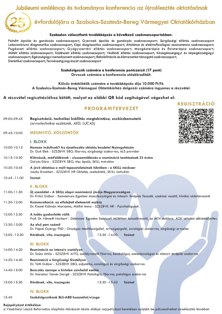 A rendezvény külön figyelmet fordít a gyakorlati tudás fontosságára: a nap zárásaként szakdolgozók számára BLS–AED használati képzés és vizsga is elérhető. A program részeként rajzpályázat értékelésére is sor kerül, amelyet a Vásárhelyi László Református Alapfokú Művészeti Iskola diákjai hirdettek meg az újraélesztés témájában.