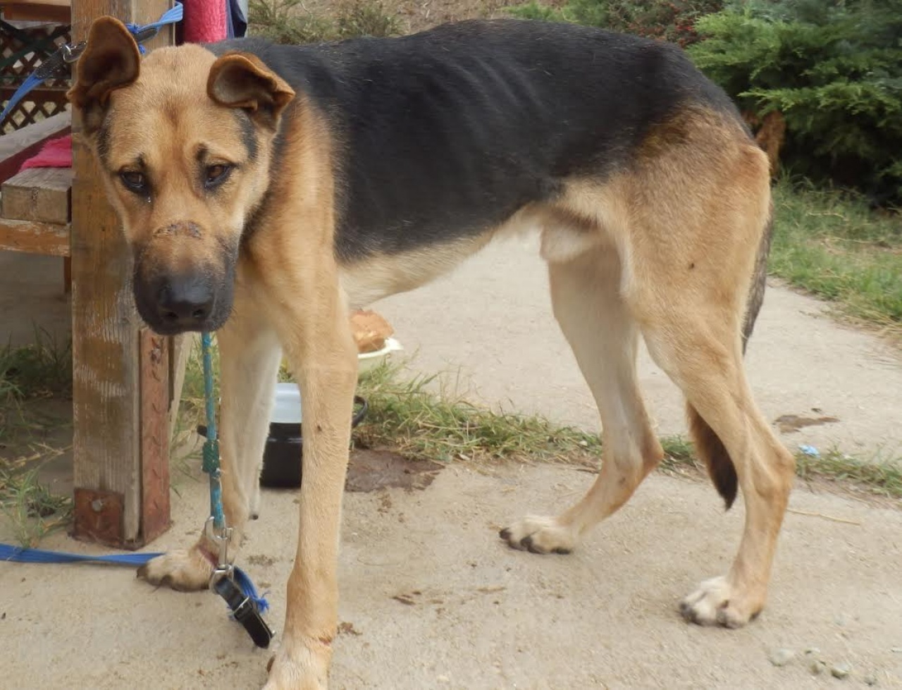 A mai napon állandó segítőnk, Mariann telefonált kétségbe esetten, hogy egy, a Napkor határában lévő dinnyeföldön egy német juhász jellegű sovány kutyát találtak. A kutya felállni nem tudott, mivel mellső lábait gyorskötöző műanyag szalaggal szorosan átkötötték. A magasra nőtt növényzetben alig lehetett észrevenni a földön lapuló kutyát. A pofája szintén gyorskötözővel volt összekötve. Mind a lábán, mind a pofáján egészen a húsig hatolt a műanyag zsinór.