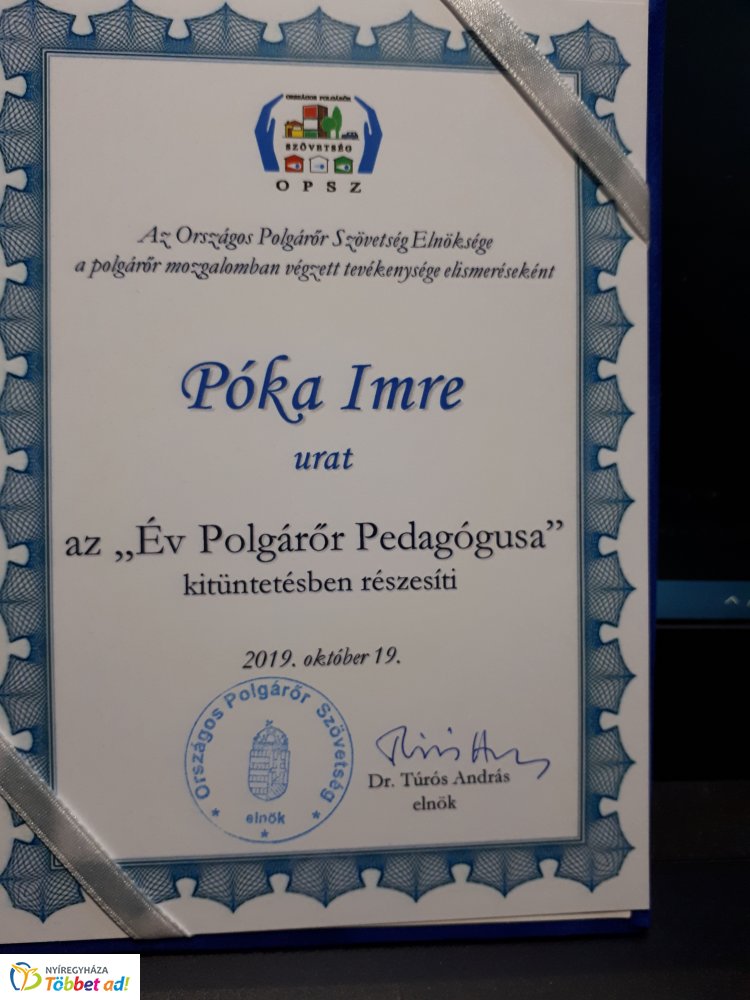 Az Országos Polgárőr Szövetség elnöksége a polgárőr mozgalomban végzett tevékenysége elismeréseként az „Év Polgárőr Pedagógusa" kitüntetésben részesítette Póka Imrét.