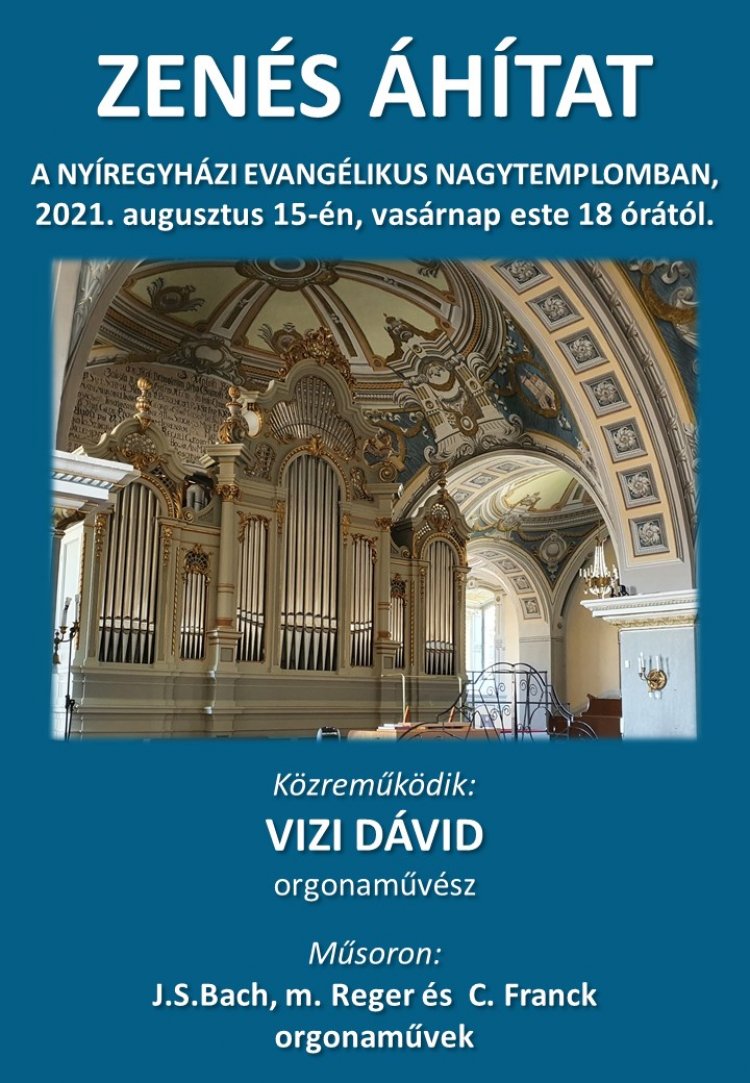 Az evangélikus egyház ismét zenés áhítatra hívja az érdeklődőket: augusztus 15-én, vasárnap este 18 órakor az evangélikus nagytemplomba, amelyen Vizi Dávid fiatal orgonaművész J.S.Bach, M. Reger és C. Franck orgonaműveket fog előadni.