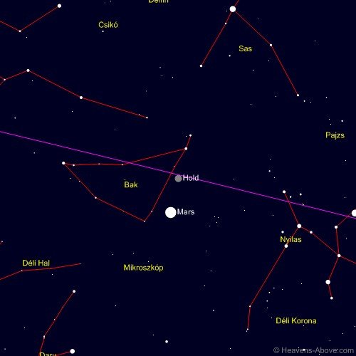 A Hold és a Mars elhelyezkedése július 27-én kora este a csillagos háttér előtt