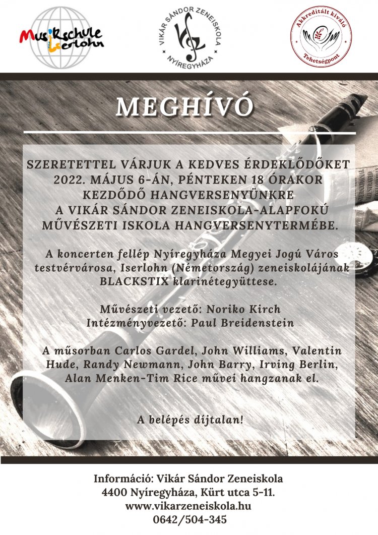 Nyíregyháza MJV testvérvárosa, Iserlohn zeneiskolájának klarinétegyüttese mutatkozik be május 6-án Nyíregyházán. A zenekedvelő közönséget a Vikár Sándor Zeneiskolába várják.