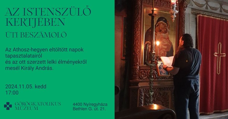 November 5-én, kedden 17 órától „Az Istenszülő kertjében” címmel úti beszámolót hallgathatunk meg a Görögkatolikus Múzeumban.