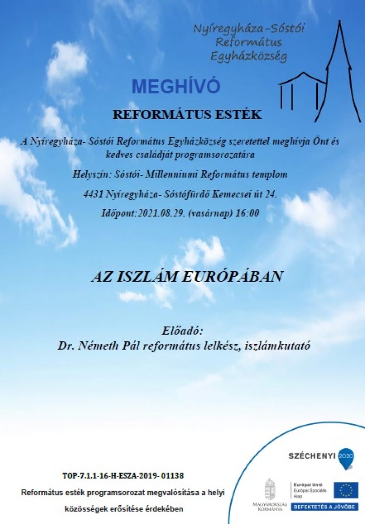 Augusztus 29-én folytatódik a Református esték programsorozat a sóstói templomban. Ez alkalommal dr. Németh Pál református lelkész, iszlámkutató lesz az est vendége.