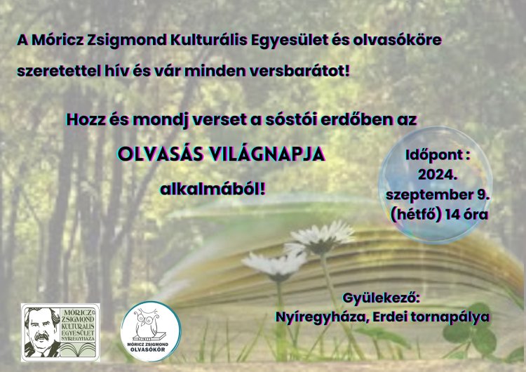 A Móricz Zsigmond Kulturális Egyesület és Olvasóköre 2024. szeptember 9-én, hétfőn l4 órakor szeretettel hívja és várja a versbarátokat az erdei tornapályához, ahol a színpadon közösen előadjuk Váci Mihály: Szabadon című versét. Ezt követően az idén 100 éve született "szőke város" fia stílusos versének hangulatkeltő sorai szellemében indulunk a vadregényes sóstói erdőbe!