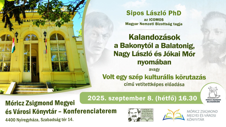 A Móricz Zsigmond Olvasókör szeptember 8-i találkozóján Sipos László Phd tagtársunk Kalandozások a Bakonytól a Balatonig, Nagy László és Jókai Mór nyomában, avagy volt egy szép kulturális körutazás címmel 16 óra 30 perctől vetítettképes előadást tart a könyvtár konferenciatermében az Olvasás Világnapján.