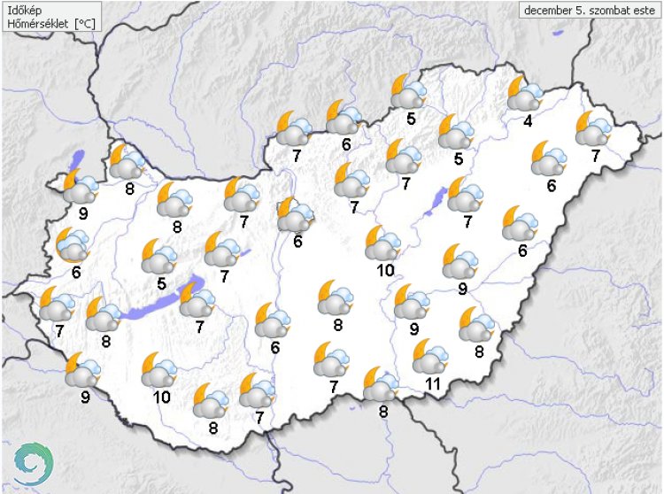 Késő estére 2 és 10 fok közé hűl le a levegő. Általában derült vagy fátyolfelhős lesz az ég. Csapadék nem valószínű. A délkeleti szelet több helyen élénk, az Észak-Dunántúlon és a Dél-Alföldön olykor erős lökések kísérik. A legalacsonyabb éjszakai hőmérséklet 0 és +9 fok között valószínű.