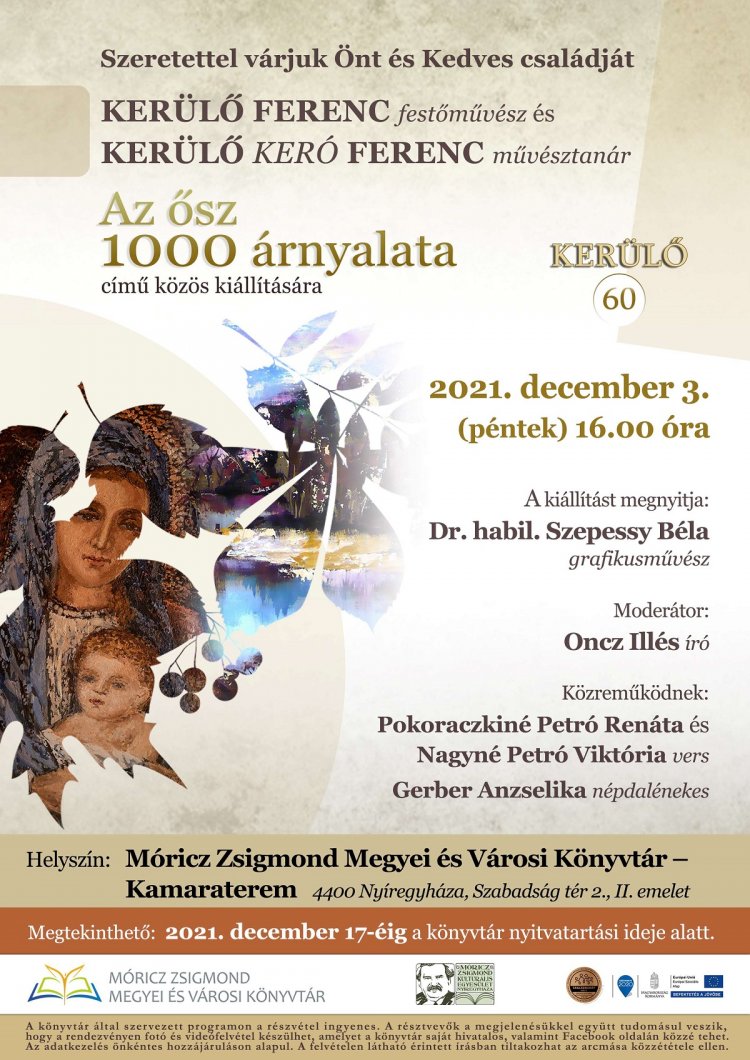 Kerülő Ferenc festőművész és Kerülő „Keró" Ferenc művésztanár közös kiállítása fogadja a látogatókat december 3-tól a megyei könyvtárban. Az ősz 1000 árnyalata című tárlat december 17-ig tekinthető meg.