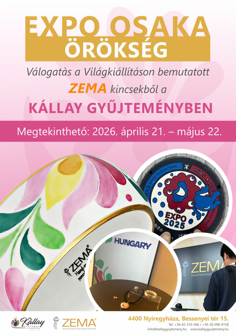 „EXPO OSAKA ÖRÖKSÉG – Válogatás a Világkiállításon bemutatott ZEMA kincsekből” címmel nyílik időszaki kiállítás a nyíregyházi Kállay Gyűjteményben. A tárlat megnyitóját 2026. április 21-én 11 órakor tartják.
