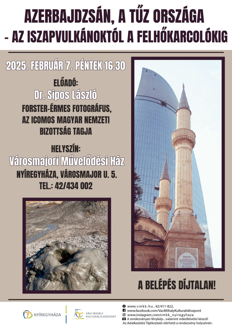2025. február 7-én, pénteken 16.30 órai kezdettel Dr. Sipos László Forster – érmes fotográfus vetítettképes előadást tart Azerbajdzsán, a tűz országa – az iszapvulkánoktól a felhőkarcolókig címmel a Városmajori Művelődési Házban.