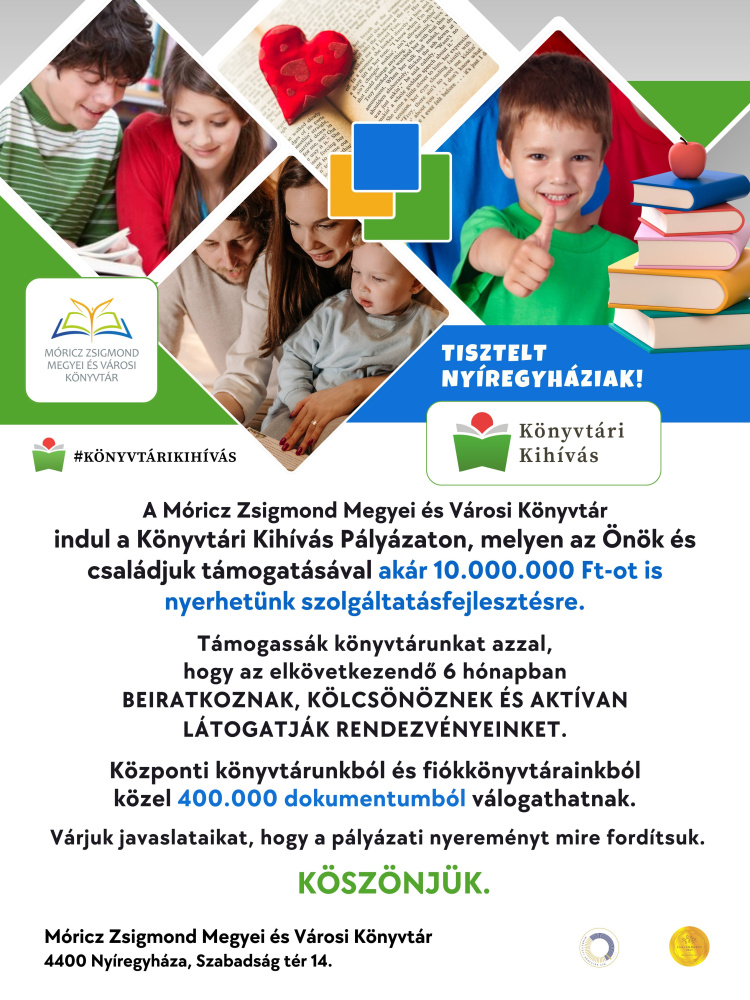 A Móricz Zsigmond Megyei és Városi Könyvtár indult a Könyvtári Kihívás Pályázaton, melyen a kölcsönzők támogatásával akár 10.000.000 Ft-ot is nyerhetnek szolgáltatásfejlesztésre.