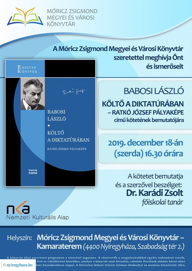 Babosi László Ratkó Józsefről készített könyvét mutatják december 18-án a Móricz Zsigmond könyvtárban. Az irodalombarátokat 16.30 órára a kamaraterembe várják.