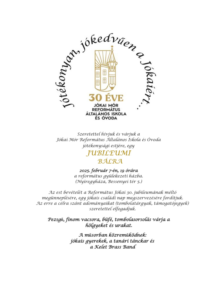 Nagyszabású bálra készül a Jókai Mór Református Általános Iskola és Óvoda. Az intézmény idén ünnepli fennállásának 30. évfordulóját. Február 7-én 19.00 órakor a református gyülekezeti házban (Nyíregyháza, Bessenyei tér 5.) jubileumi bál rendeznek. Az est bevételét pedig a Református Jókai 30. jubileumának méltó megünneplésére, egy jókais családi nap megszervezésére fordítják.