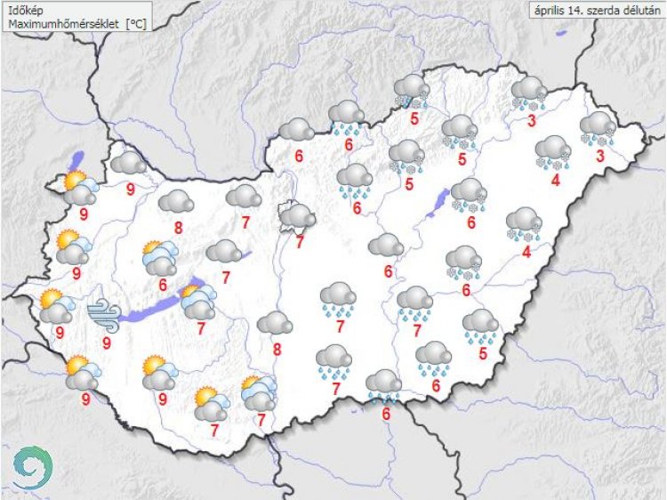 Az északi, északnyugati szelet a Dunántúl legnagyobb részén és a Zempléni-hegység körül viharos lökések kísérik. A legmagasabb nappali hőmérséklet 3 és 9 fok között alakul, a nyugati, délnyugati megyékben a magasabb értékekkel. Késő estére 1 és 6 fok közé csökken a hőmérséklet.