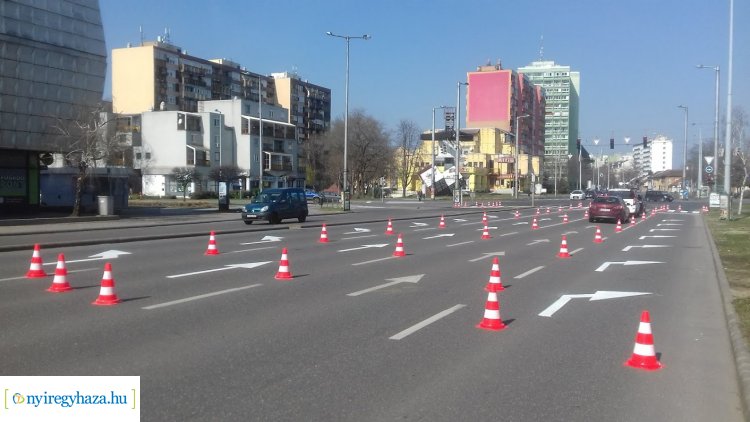 Befejeződött a burkolati jelek festése a Kelet Áruház előtti nagykereszteződésben, így megszűnt a torlódás az adott útszakaszon.
