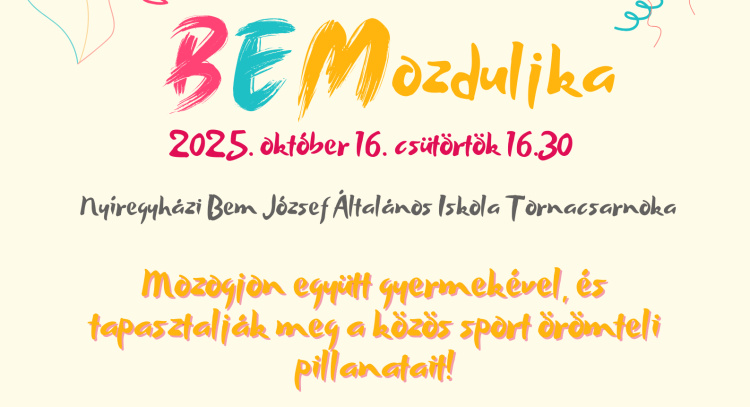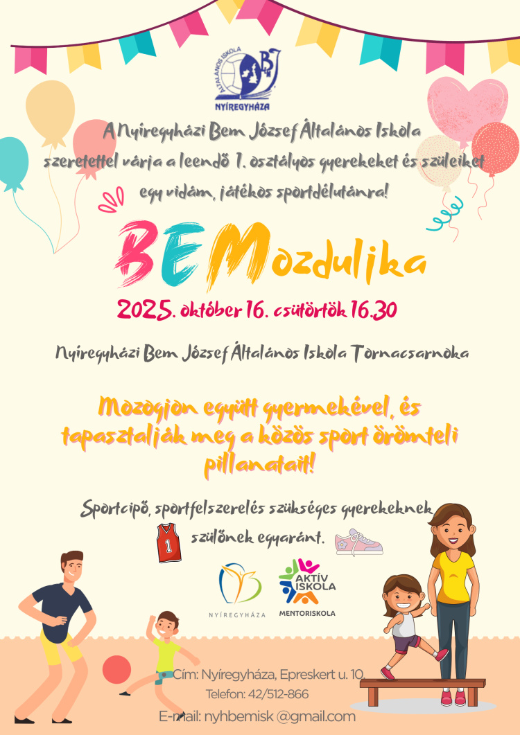 A Nyíregyházi Bem József Általános Iskola szeretettel várja az iskolába készülő gyerekeket és szüleiket 2025. október 16-án 16.30 órától tartandó iskolára hangoló játékos sportfoglalkozására.