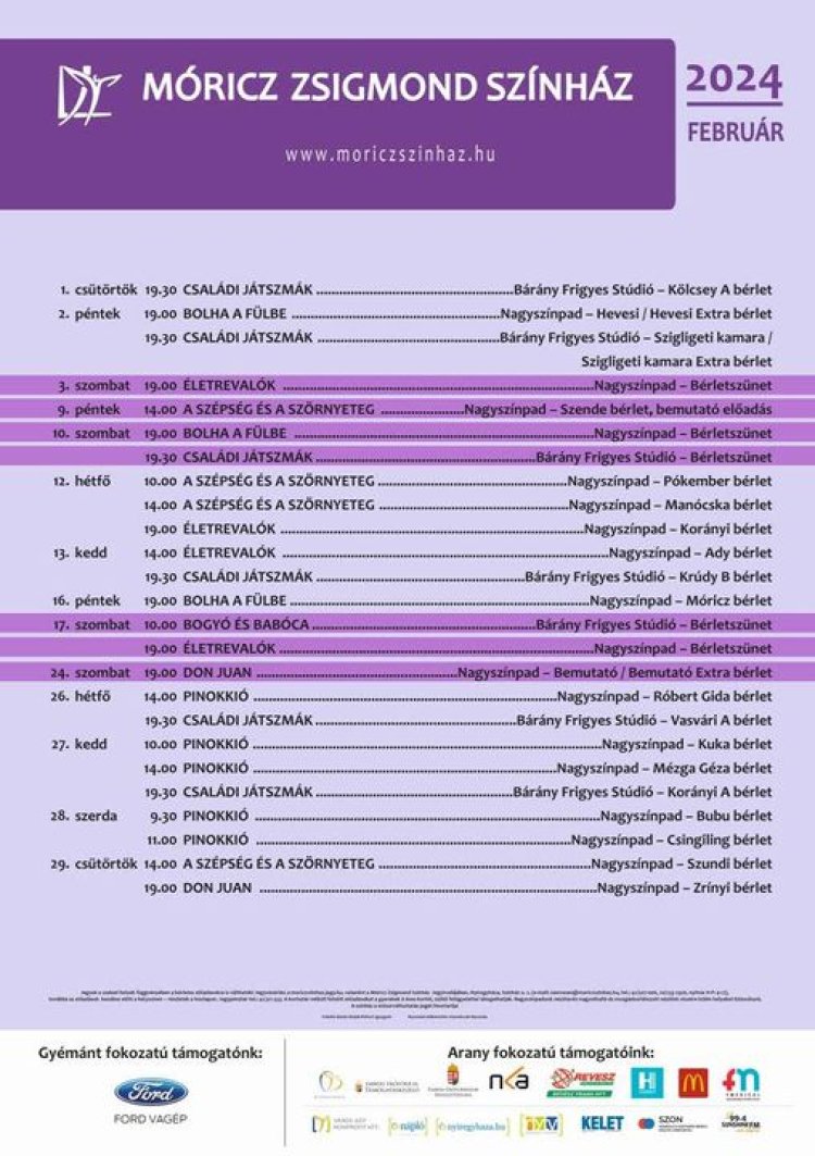 A hónap első bemutatójára február 9-én esedékes, 14 órakor mutatják be A Szépség és a Szörnyeteg című gyermekelőadást, amit Halasi Dániel rendez a nagyszínpadon.