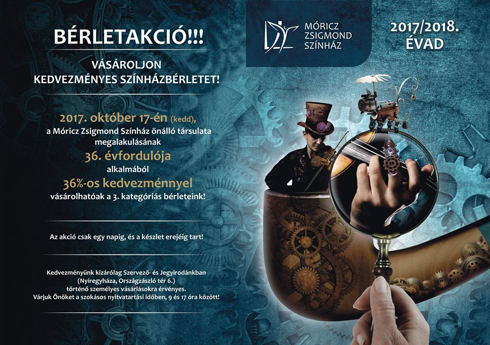 Vásároljon kedvezményesen színházbérletet!2017. október 17-én (kedd), a Móricz Zsigmond Színház önálló társulata megalakulásának 36. évfordulója alkalmából 36%-os kedvezménnyel vásárolhatóak a 3. kategóriás bérletek.