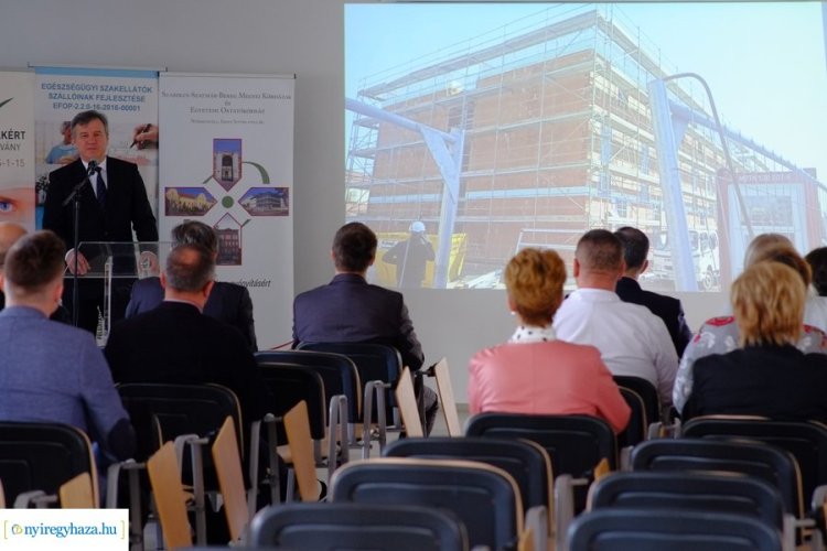 „Szeptember végén találkoztunk, amikor az alapkőletétel megtörtént. Egy 118 fő elhelyezésére alkalmas nővérszálló épül, de már akkor is elmondtam, hogy egy kicsit szélesebb körben gondolkodunk. Nemcsak nővérek, de fiatal, kezdő orvosok, orvos házaspárok számára is szeretnénk lehetővé tenni a lakhatást ebben az épületben. Lényegében minigarzon lakásokat alakítanak ki, és magas ár-érték arányban tudjuk majd biztosítani dolgozóink számára a lakhatást. Gép, műszer, minden nagyon fontos, de a humán erőforrást semmi nem helyettesítheti. Azért is öröm, hogy ez Nyíregyházán megvalósulhatott, mert éppen itt van a legnagyobb hiány a szakdolgozókból. A városi jellegű telephelyeken szakdolgozókkal jobb a helyzet, ott inkább kevesebb orvossal dolgozunk. Ezért itt már Nyíregyházán az új nővérszállóban remélhetőleg fogadni tudjuk azokat a munkatársainkat is, akik a vármegye távolabbi részéből, vagy más vármegyéből szeretnének a mi intézményünkben dolgozni” – szólt a lehetőségekről a vármegyei kórház főigazgatója.