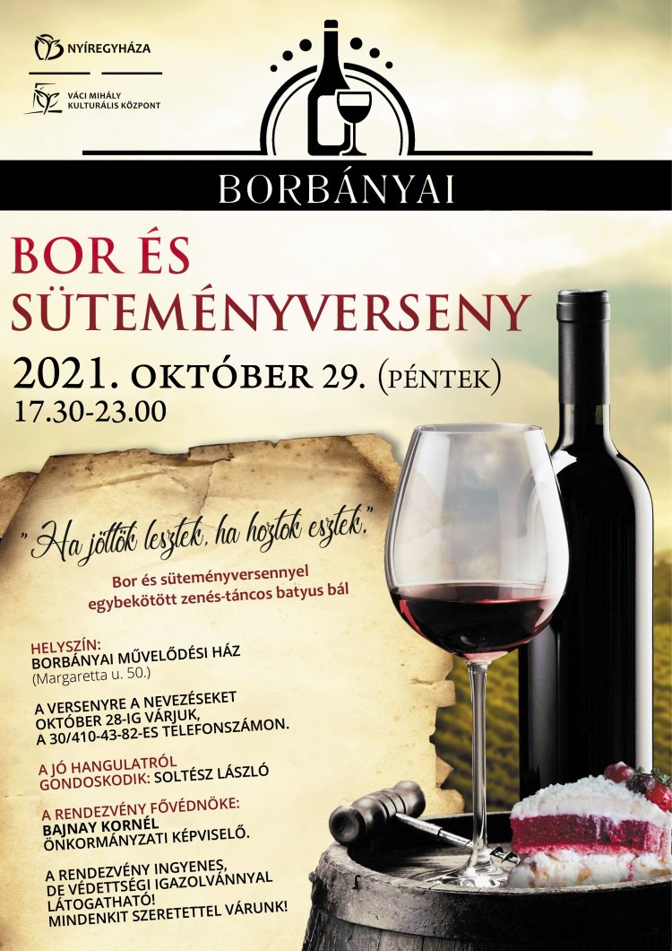 Bor és süteményversennyel egybekötött zenés-táncos rendezvény várja Borbánya lakóit október 29-én, a helyi művelődési házban. A versenyre a nevezéseket október 28-ig várják. A rendezvény ingyenes, de védettségi igazolvánnyal látogatható!