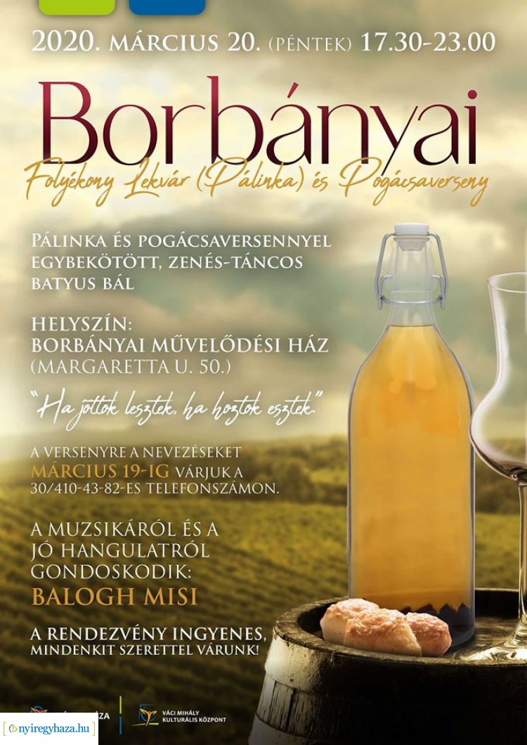 Elmarad! - Pálinka- és pogácsaversennyel egybekötött zenés-táncos mulatság várja Borbánya lakóit március 20-án. A batyus bálon a muzsikáról Balogh Misi gondoskodik.