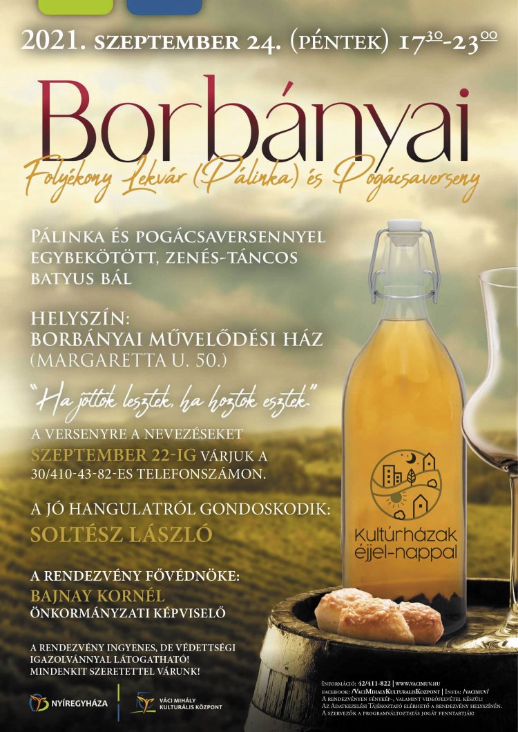 Pálinka- és pogácsaversennyel egybekötött zenés-táncos batyus bál várja Borbánya lakóit szeptember 24-én, a művelődési házban. A versenyre a nevezéseket szeptember 22-ig várják a 30/410-4382-es telefonszámon. A rendezvény védettségi igazolvánnyal látogatható!