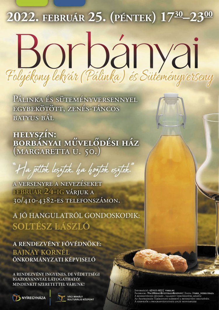 Pálinka és süteményversennyel egybekötött, zenés-táncos batyus bálra várják Borbánya lakóit február 25-én, a helyi művelődési házba. A versenyre február 24-ig fogadnak el nevezéseket.