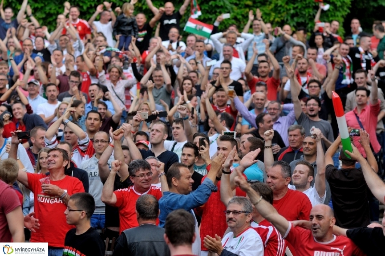 Az EB debütáló meccsre nagyon sokan voltak kíváncsiak. Nemcsak a Szabadság tér telt meg, hanem a Szabadtéri Színpad is. Itt szurkoltak a nyíregyházi ultrák, akik minden fontosabb pillanatban felugráltak a székeikből és rigmusokat énekeltek. A mérkőzés első felében azonban még mindig nagyon kiegyenlített volt a játék, és sokan ekkor még nem hitték el, hogy a magyar csapat nyerni képes. Sőt voltak, akik Szalai Ádám teljesítményével sem voltak elégedett.