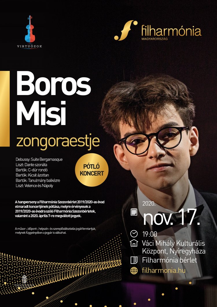 Debussy, Bartók és Liszt művei szerepelnek Boros Misi zongoraestjének műsorán november 17-én, a Váci Mihály Kulturális Központban. A hangverseny a Filharmónia Szezonbérlet 2019/2020-as évad elmaradt koncertjének pótlása.