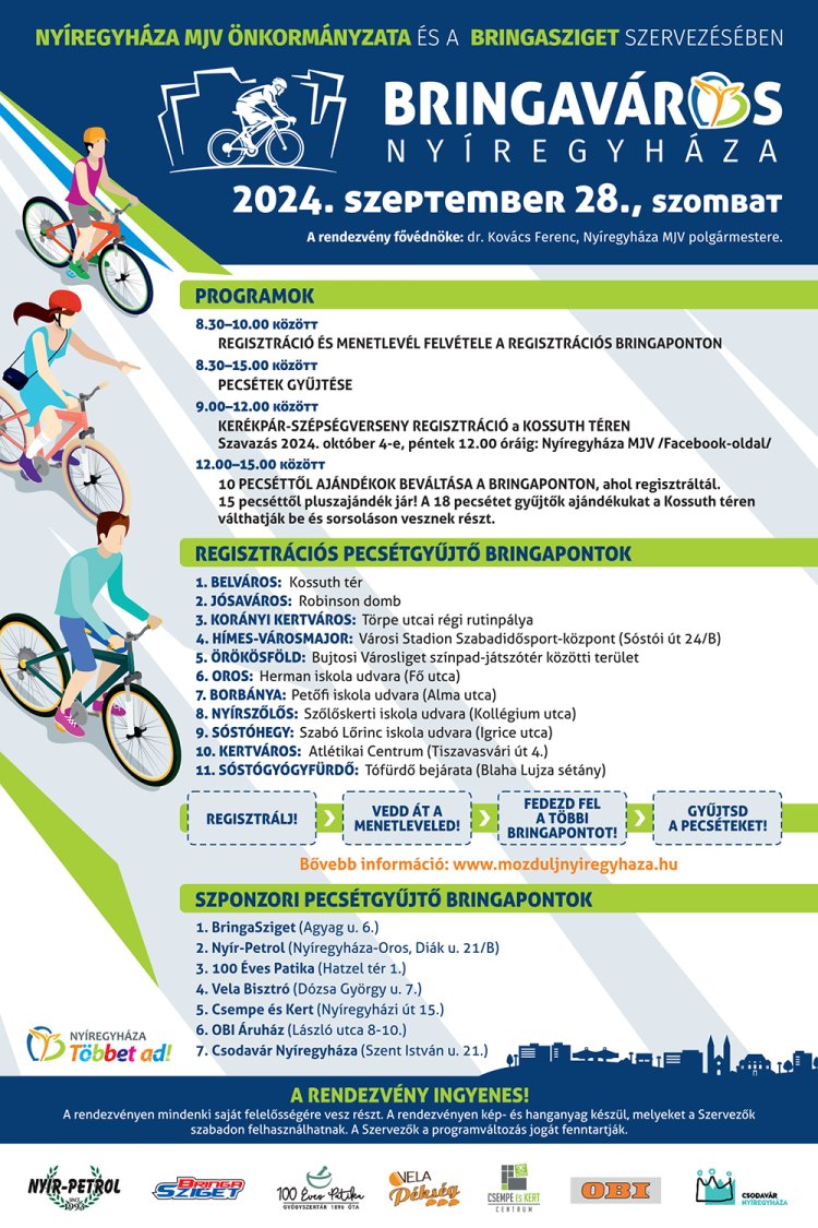 Nyíregyháza MJV Önkormányzata és a Bringasziget szeptember 28-án, 7. alkalommal rendezi meg a 11 regisztrációs és 7 szponzori pontot érintő családi szabadidős sportrendezvényét, a „Bringavárost" Nyíregyházán. A rendezvény célja: a közel 80 km városi kerékpárút hálózat felfedezésével eljutni a különböző városrészekbe, valamint az egészséges életmód és a mozgás népszerűsítése.