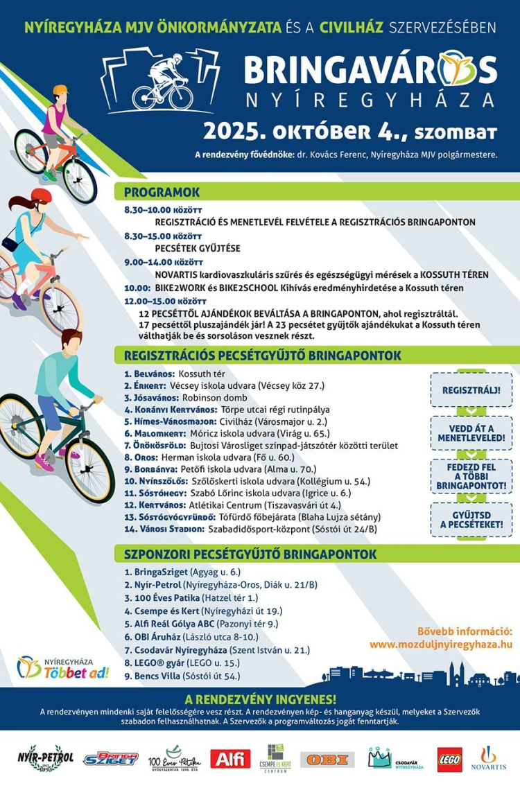 Nyolcadik alkalommal szervezik meg Nyíregyházán a Bringaváros rendezvényt, idén összesen 23 pecsétgyűjtő várja majd a résztvevőket. Minden állomáson különböző programokkal is készülnek a kerékpárosoknak, gyerekeknek és felnőtteknek egyaránt. Az összes pecsétet összegyűjtők között egy értékes kerékpárt sorsolnak ki, de azok is kapnak ajándékot, akik legalább 12 helyszínre eltekernek és begyűjtik a pecséteket.