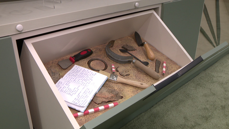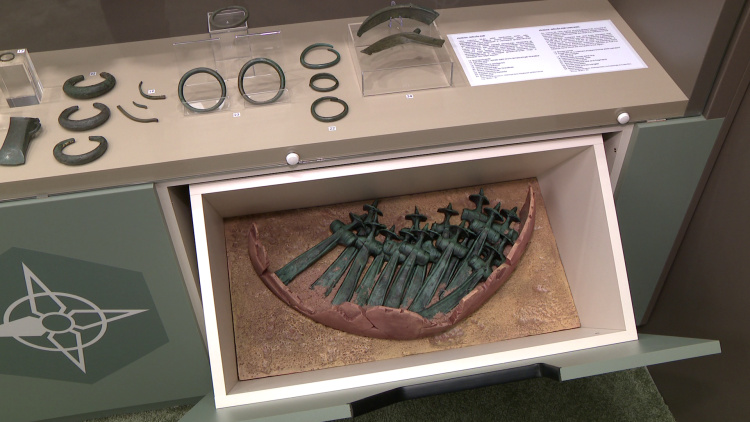 Ajakról például előkerült nyakkorongos harci csákányok és egy kardtöredék, az alatta lévő diorámában pedig azt mutatják be, ahogy megtalálták a föld alatt az eszközöket.