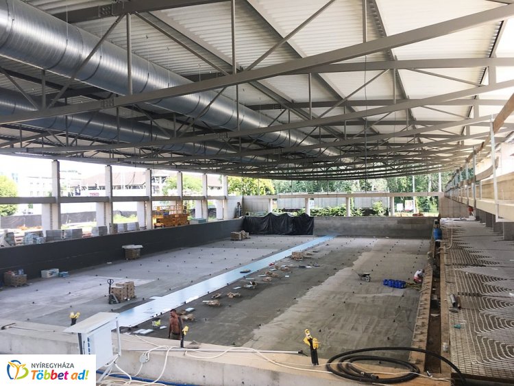 A tetőszerkezet a közelmúltban került a helyére, az épülő sportlétesítmény egy hónappal ezelőtt kapott bokrétát, hiszen akkor érte el a kivitelező az uszoda legmagasabb pontját.