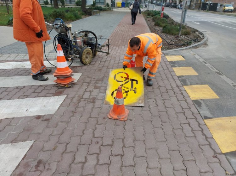 Megkezdődött a belvárosban a burkolati jelek festése, először a kerékpárutakat jelző piktogramokkal.