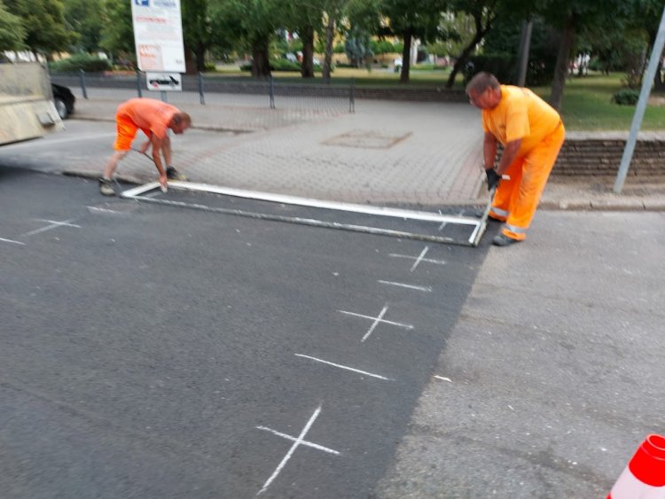 A nagyfelületű kátyúzási munkálatok után megkezdődtek a burkolati jelek újrafestése, többek között a Hősök terén is.