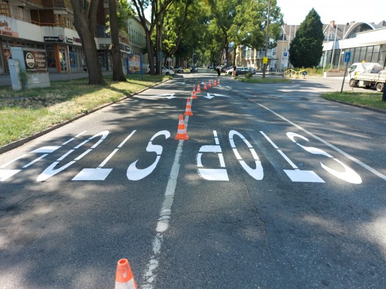 Burkolati jeleket festettek vasárnap az Országzászló tér mellett, a Szarvas utcai csomópontban.