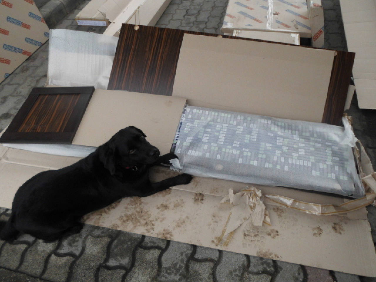 Egy lapokra szerelt, bútort szállító férfit ellenőriztek a pénzügyőrök Záhonynál. A férfi és utasa csupán a megengedett mennyiségű cigarettát jelentették be, azonban a pénzügyőrök gyanúsnak találták a szállítmányt, így tételes vizsgálatot tartottak. Sydney, a szolgálati kutya azonnal megtalálta a bútorlapok közzé rejtett cigarettát.