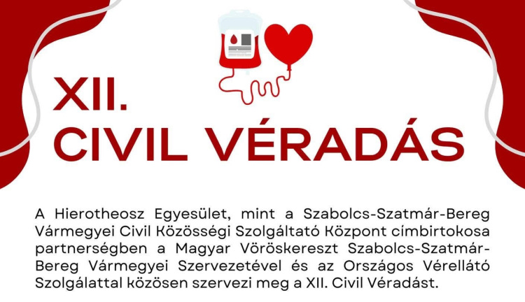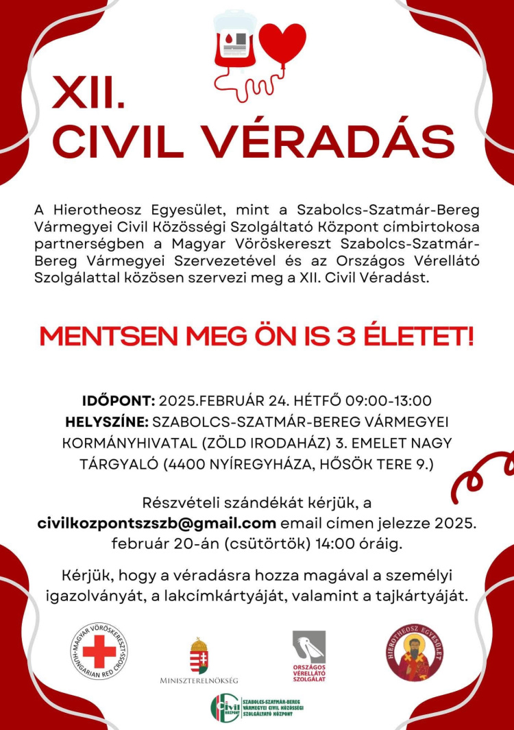 A Szabolcs-Szatmár-Bereg Vármegyei Civil Közösségi Szolgáltató Központ a Magyar Vöröskereszttel, és az Országos Vérellátó Szolgálat 2025. február 24-én (hétfőn) 12. alkalommal szervez Civil Véradását.