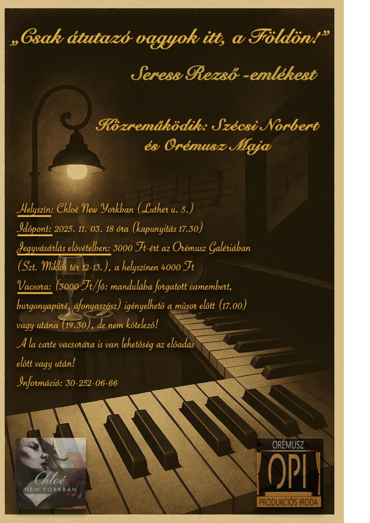 A "Csak átutazó vagyok itt, a Földön!" címet viselő esten Seress Rezső zenei örökségét eleveníti fel Szécsi Norbert és Orémusz Maja.