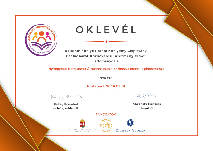Kiemelkedő szakmai elismerésben részesült a Nyíregyházi Bem József Általános Iskola Kazinczy Ferenc Tagintézménye: az intézmény elnyerte a Családbarát Köznevelési Intézmény 2025 címet.