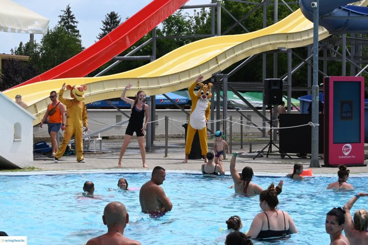 Mesefigurákkal várta az aqua-zumba és torna a Parkfürdőbe látogató vendégeket szombaton, a Családi Élménynapon. Még az ebéd utáni pihenőidőben is megtelt az olasz medence, a résztvevők aktívan vettek részt a programokon. Volt, aki már egészen a korai órákban megérkezett a helyszínre.
